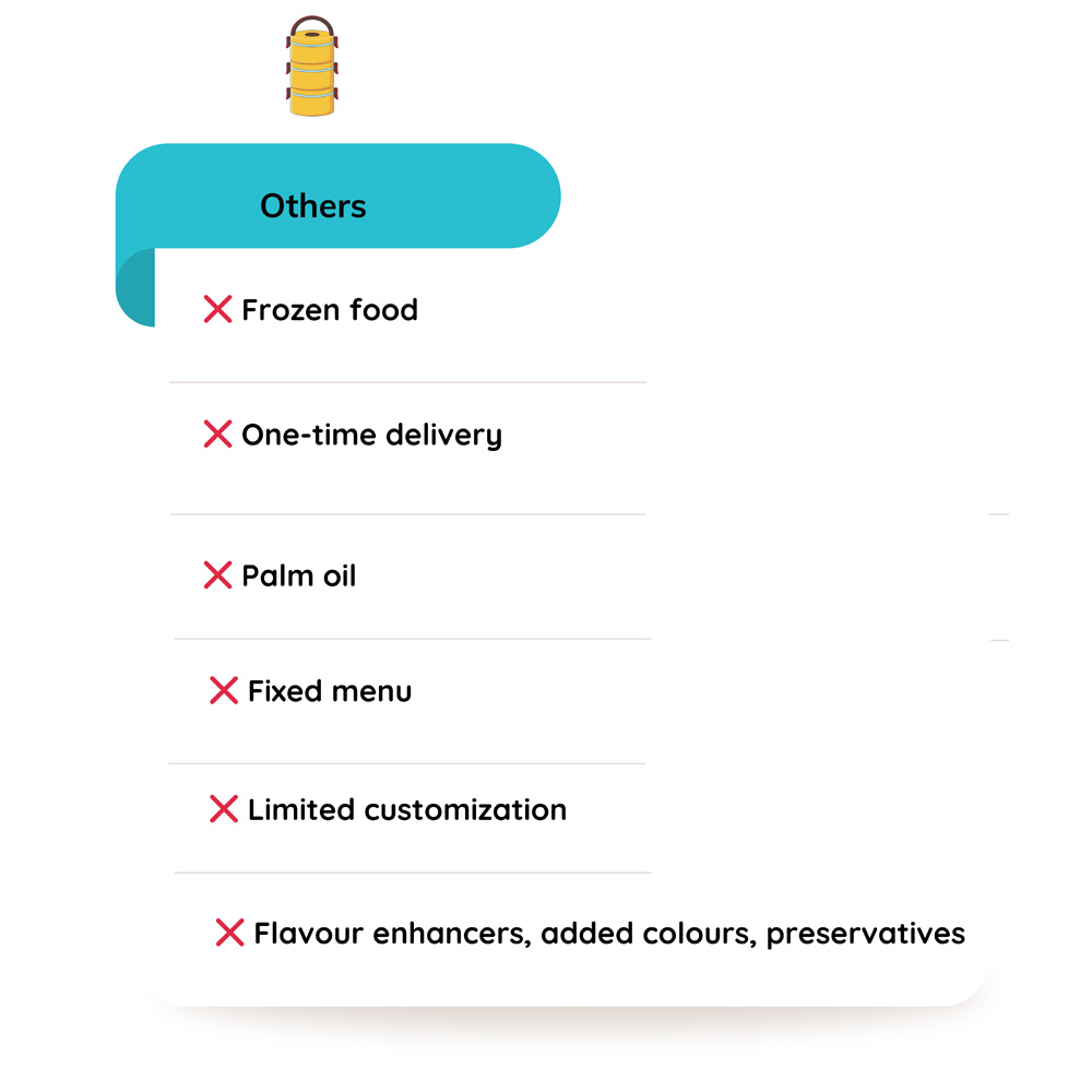 Only fresh vegetables, whole grains, cold-pressed oils, mustard oil for cooking and ghee are used. No palm oil, preservatives, artificial flavour enhancers, or frozen ingredients are included—just clean, natural foodjust like you eat at home, guaranteed.