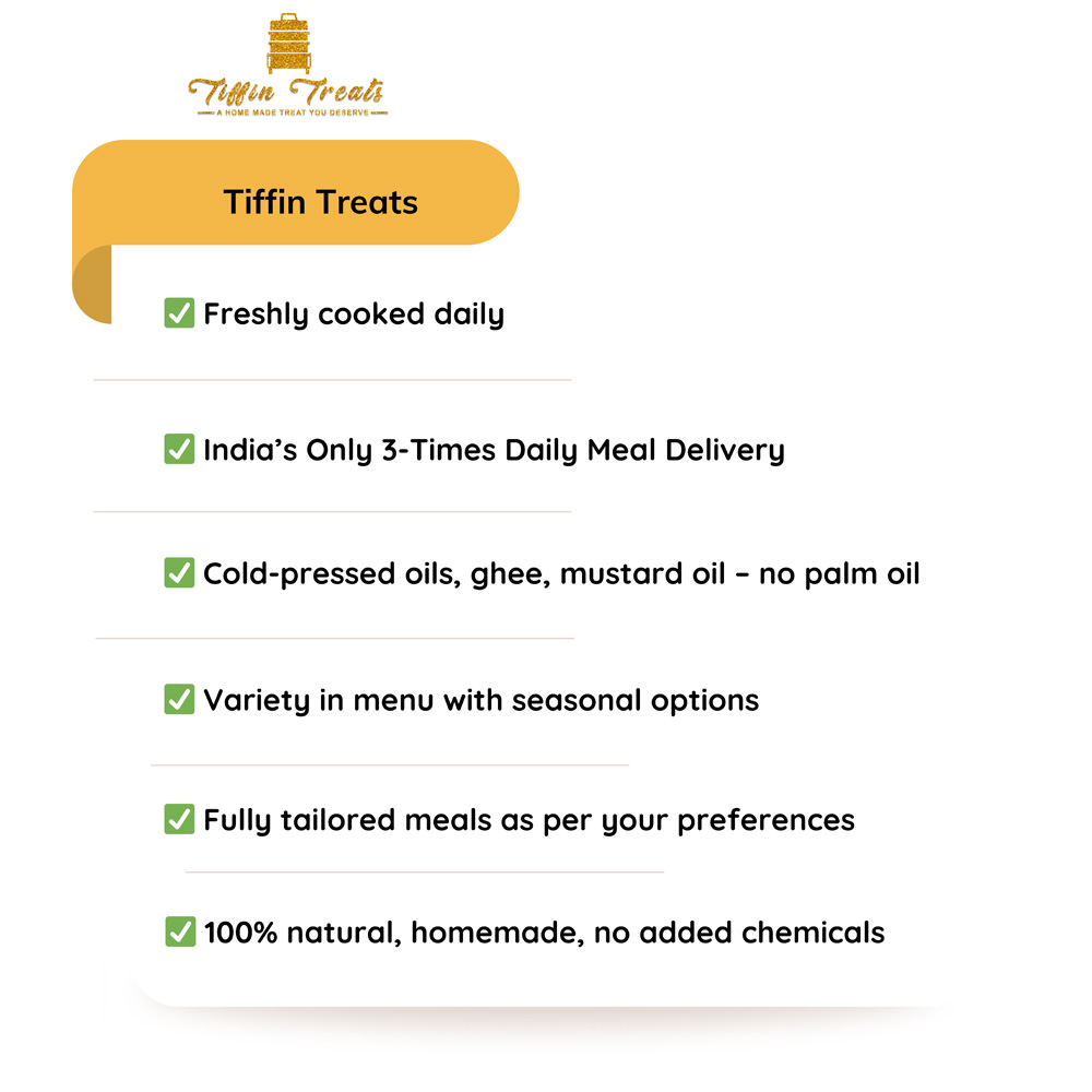 Serving since 2018, Tiffin Treats delivers fresh, wholesome meals three times a day across Yelahanka and nearby areas – fully customised, preservative-free, palm-oil-free, and made with love.